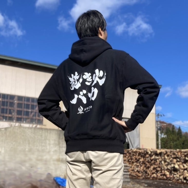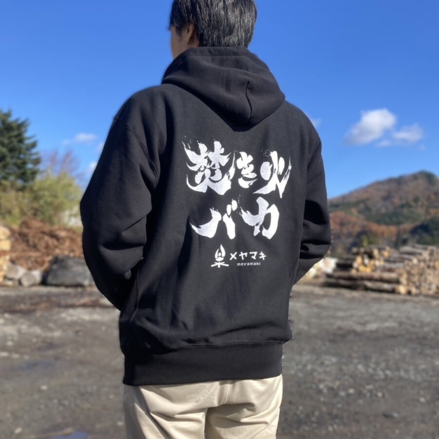 「焚き火バカ」デザインを背中にあしらったスウェットパーカーです。