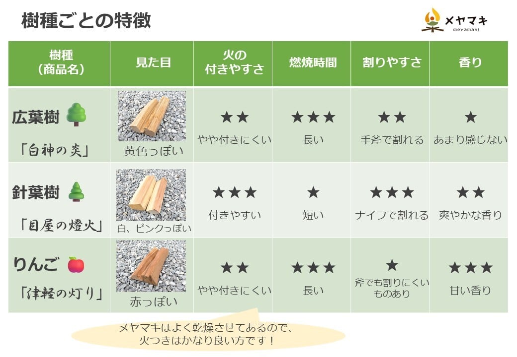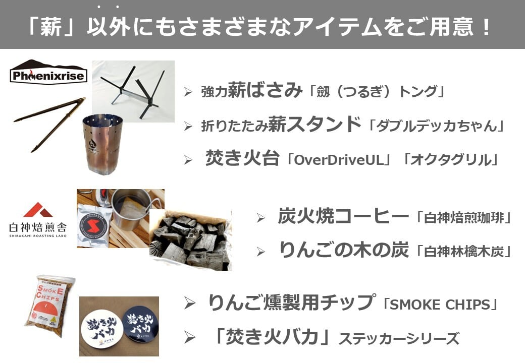 「メヤマキ」オンラインショップ(白神の薪)の主要な商品ラインナップ一覧です。